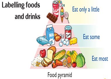 The picture shows food pyramid with 3 types of labelling foods and drinks.