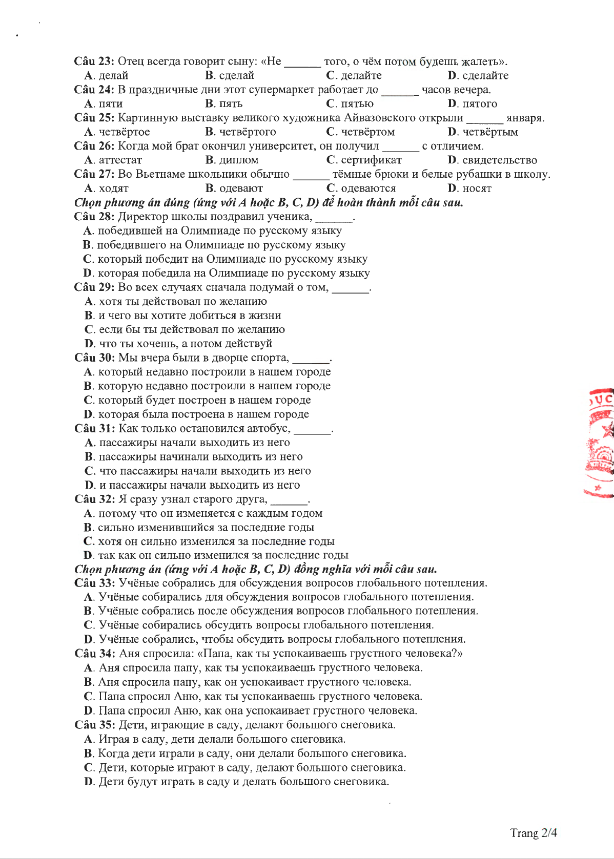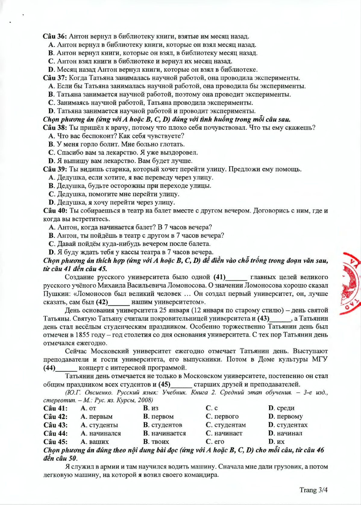 Đáp án đề minh họa 2020 môn tiếng Nga lần 2