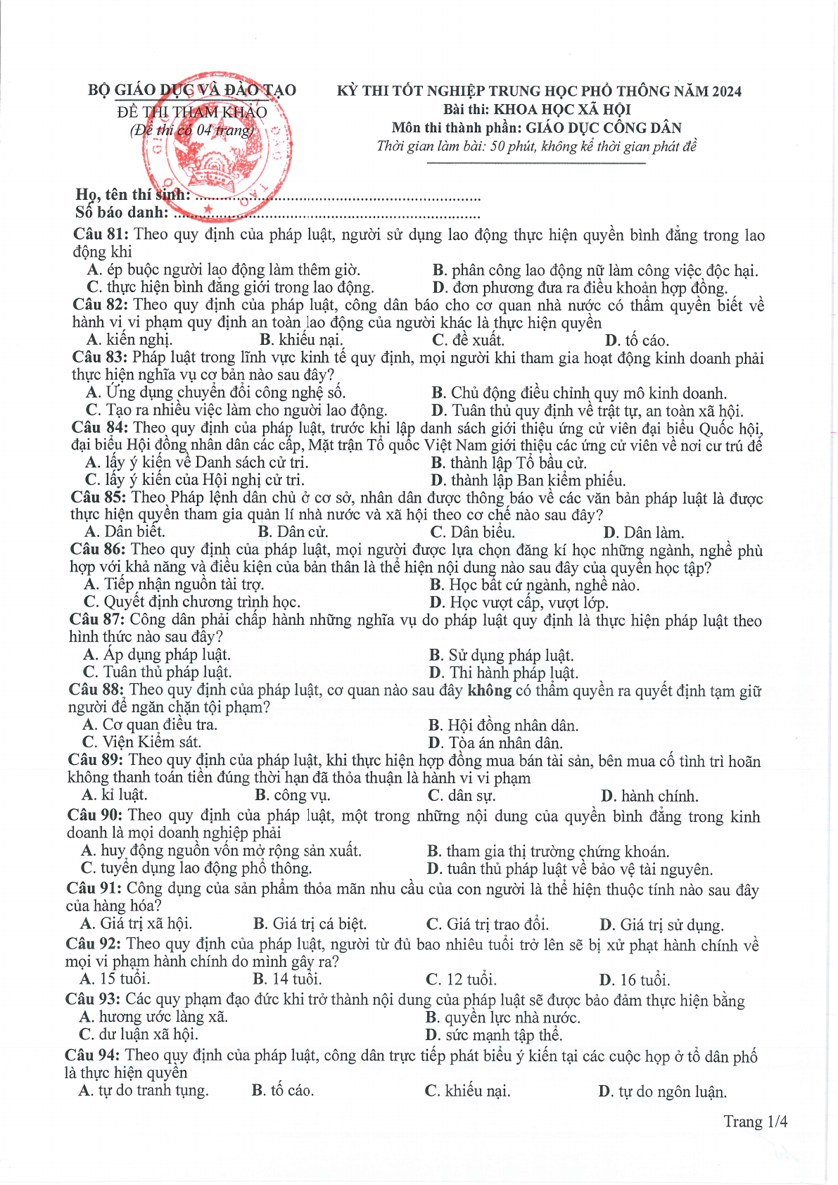 VnDoc.com xin gửi tới bạn đọc bài viết Đề thi tham khảo Kỳ thi tốt nghiệp THPT năm 2024 môn Giáo dục công dân để bạn đọc cùng tham khảo.