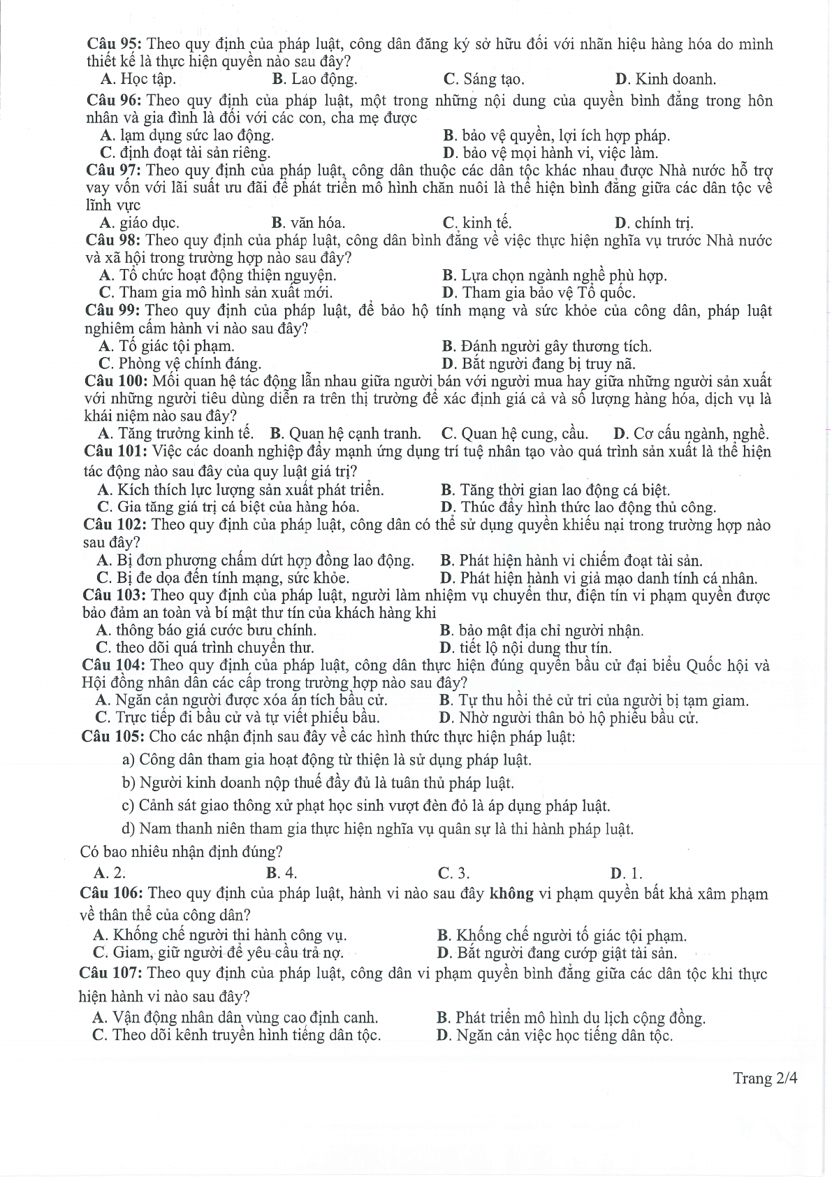 Đáp án đề minh họa 2024 môn Giáo dục công dân
