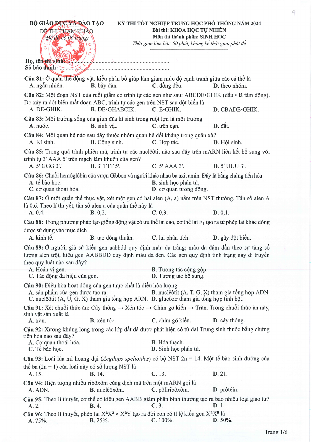 VnDoc.com xin gửi tới bạn đọc bài viết Đề thi tham khảo Kỳ thi tốt nghiệp THPT năm 2024 môn Sinh học để bạn đọc cùng tham khảo. Đề thi được tổng hợp gồm có 40 câu hỏi trắc nghiệm, thí sinh làm bài trong thời giam 50 phút.