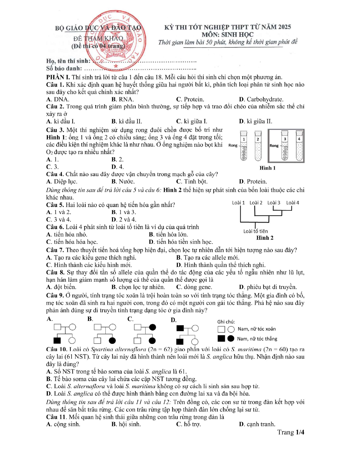 Đề minh họa môn Sinh 2025