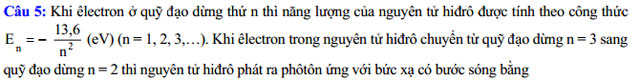 Cho biết: hằng số Plăng h = 6,625.10–34 J.s; độ lớn điện tích nguyên tố e = 1,6.10–19 C; tốc độ ánh sáng trong chân không c = 3.108 m/s.
