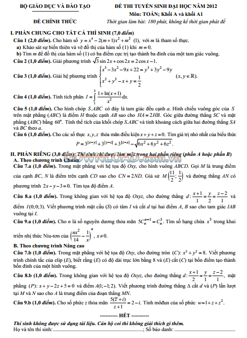Đáp án Đề thi Đại học môn Toán năm 2012 khối A, A1 cũng như phân tích các các cách giải, giải bằng nhiều cách và bình luận đề thi Đại học năm 2012 các khối A, A1 thi sáng ngày 4/7/2012.