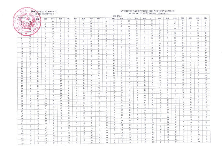 Đáp án đề 824 tiếng Nga 2021