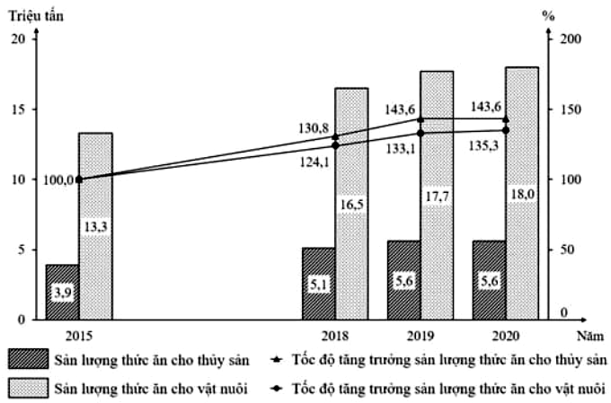 Cho biểu đồ về sản xuất thức ăn cho thủy sản và thức ăn cho vật nuôi của nước ta giai đoạn 2015 - 2020: