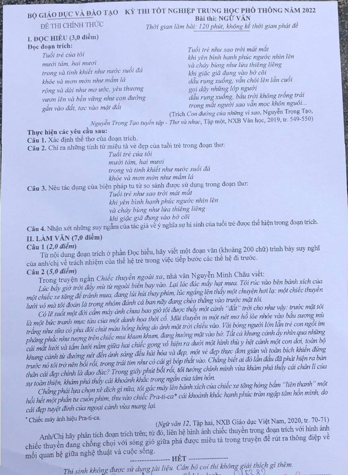 Đáp án đề Văn THPT Quốc Gia năm 2022
