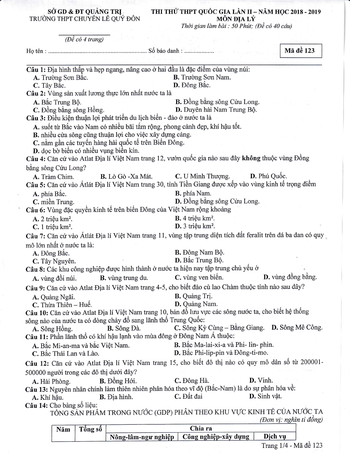 Đáp án đề thi thử THPT Quốc gia môn Địa lý năm 2019 trường THPT Chuyên Lê Quý Đôn - Quảng Trị lần 2