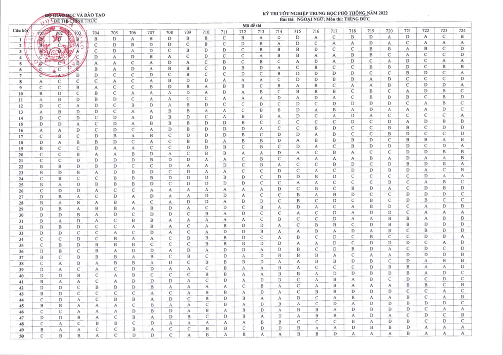 Đáp án Chính thức Đề thi tiếng Đức THPT Quốc Gia 2022