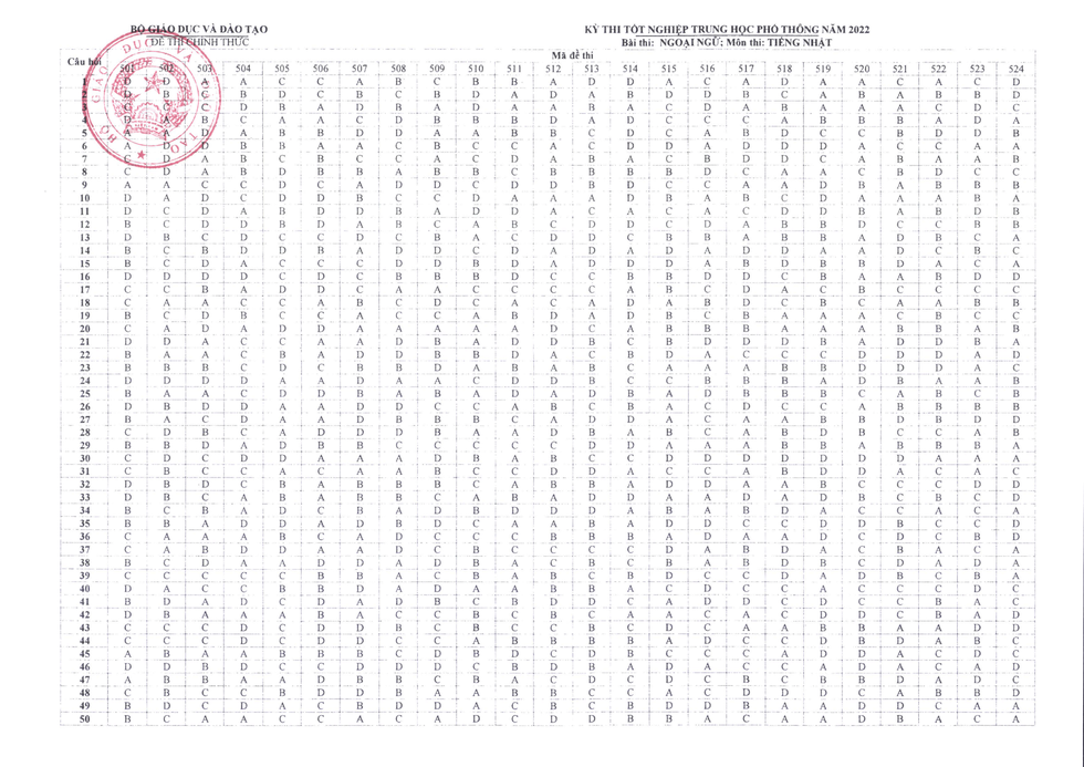 Đáp án Chính thức Đề thi tiếng Nhật THPT Quốc Gia 2022