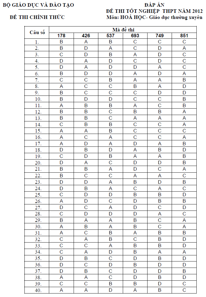 Đáp án đề thi tốt nghiệp THPT môn Hóa học theo hình thức trắc nghiệm dành cho hệ Giáo dục thường xuyên năm học 2012
