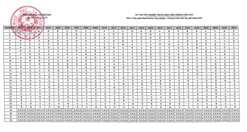 Đáp án đề thi tốt nghiệp THPT Quốc gia 2025 môn Công nghệ Công nghiệp