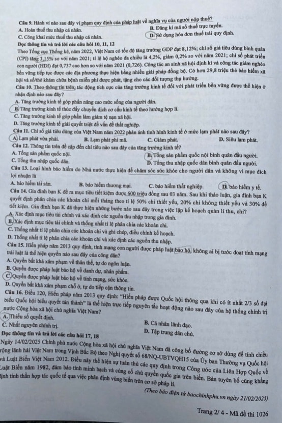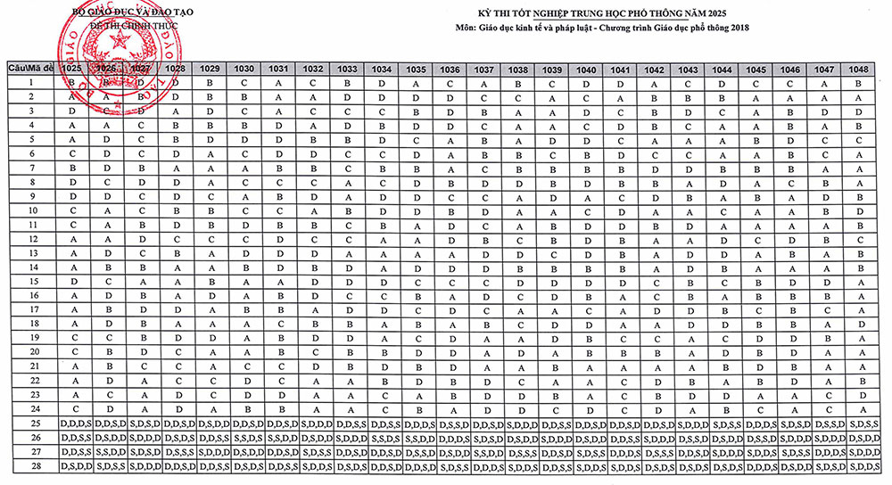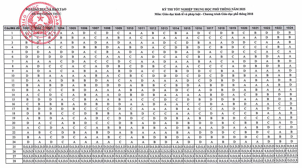 Đáp án đề thi tốt nghiệp THPT Quốc gia 2025 môn Giáo dục Kinh tế và Pháp luật