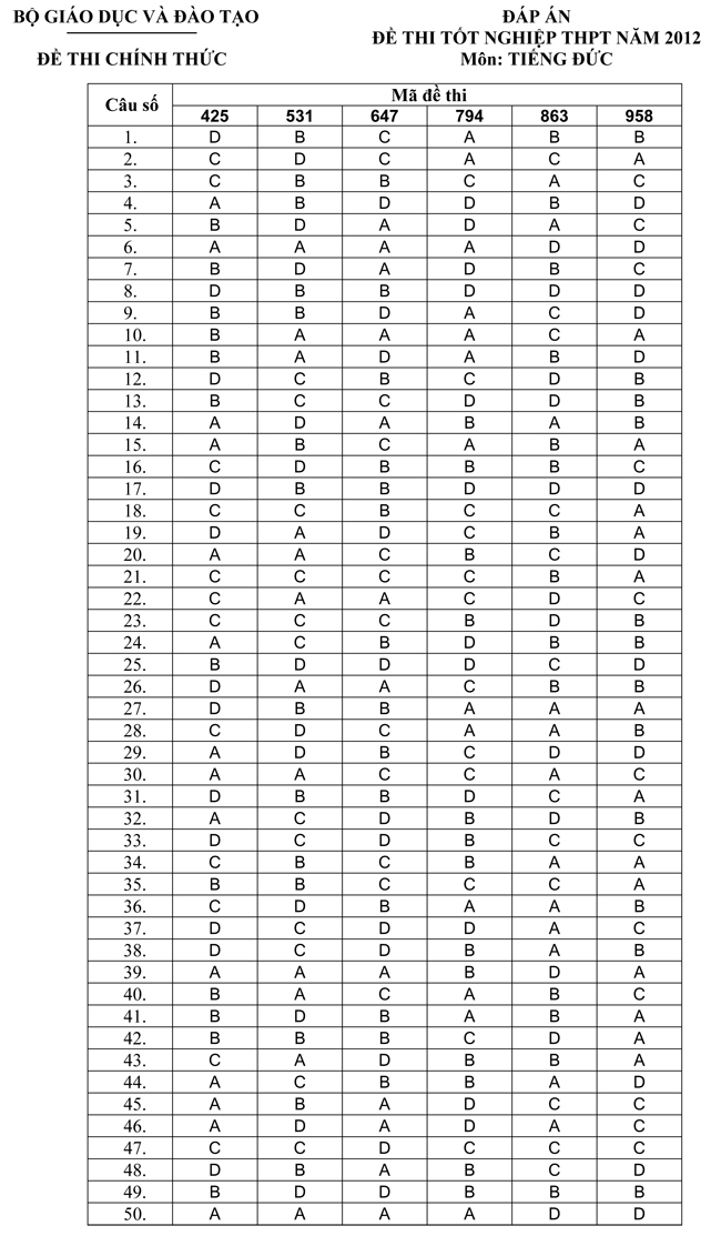 Đáp án đề thi tốt nghiệp THPT tiếng Đức hệ phổ thông theo hình thức trắc nghiệm năm 2012