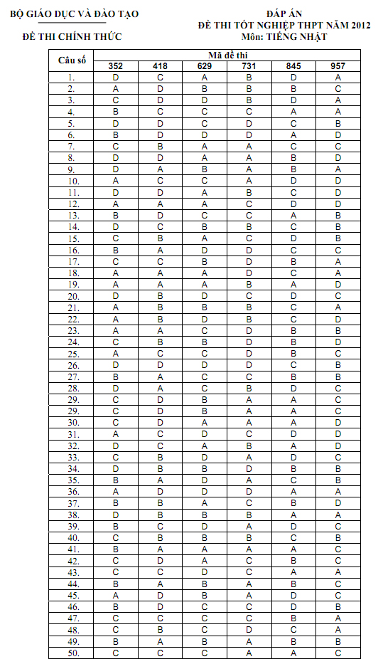 Đáp án đề thi tốt nghiệp THPT tiếng Nhật hệ Phổ thông năm 2012