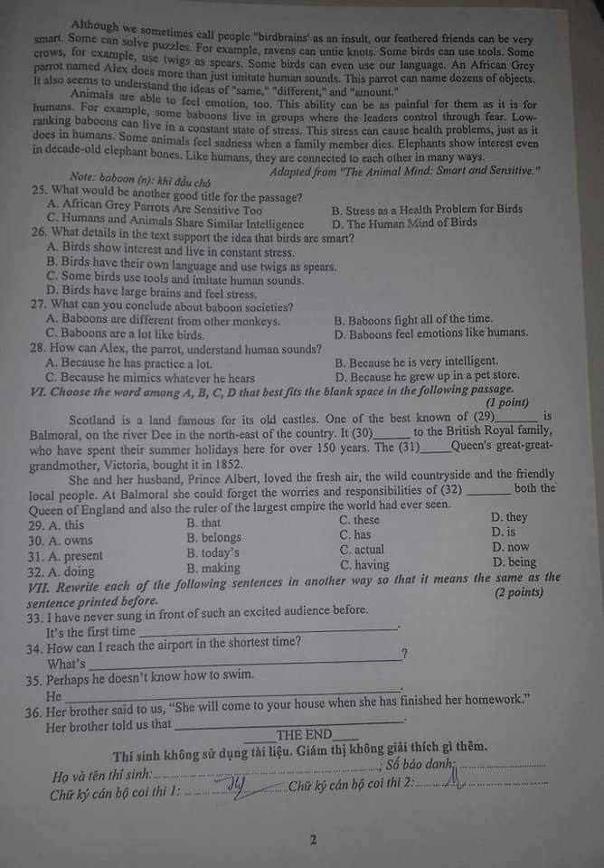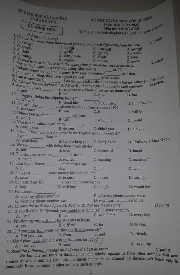 II. Đề thi tuyển sinh vào lớp 10 môn tiếng Anh Phú Yên Chính thức
