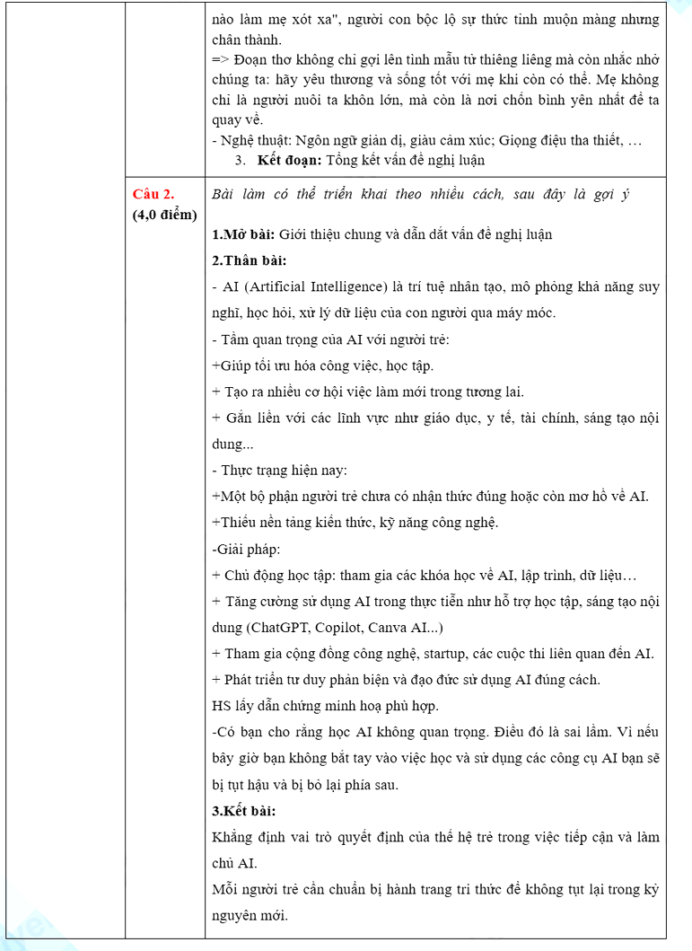 Câu 2 (4,0 điểm). Sử dụng AI đang là xu thế tất yếu trên thế giới. Em hãy viết một bài văn nghị luận trình bày các giải pháp để người trẻ phát huy tác dụng của Al trong cuộc sống hôm nay.