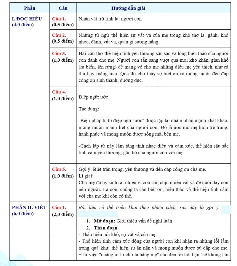 Câu 2 (0,75 điểm). Chỉ ra những từ ngữ thể hiện nỗi vất vả của người mẹ trong khổ thơ: