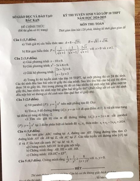 Đề thi tuyển sinh lớp 10 môn Toán 2025 Bắc Kạn