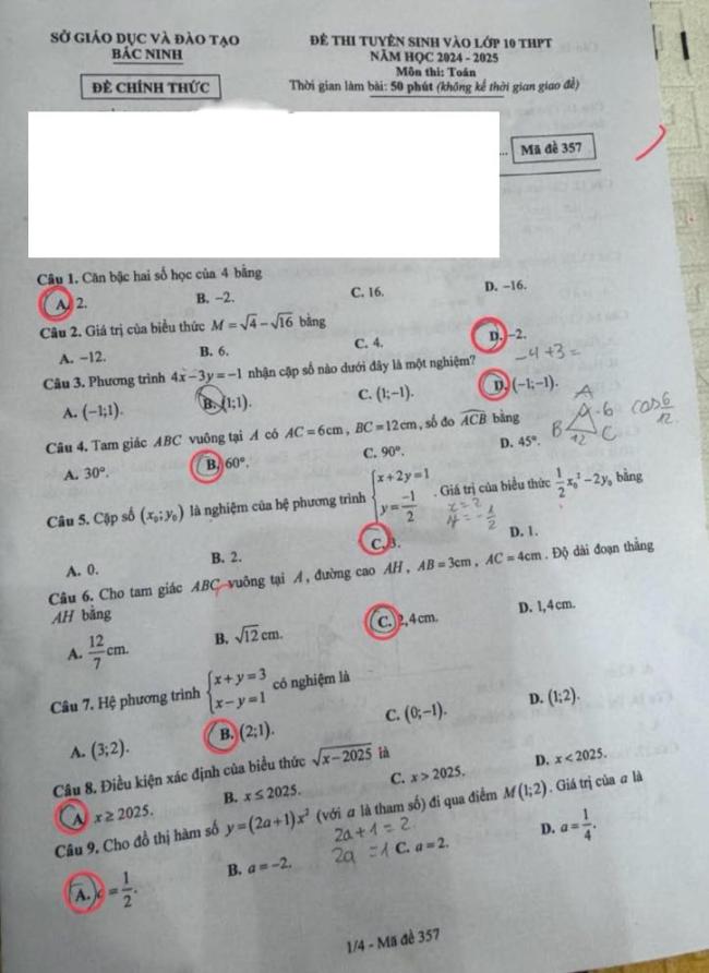 1. Đáp án đề thi vào 10 môn Toán Bắc Ninh 2025