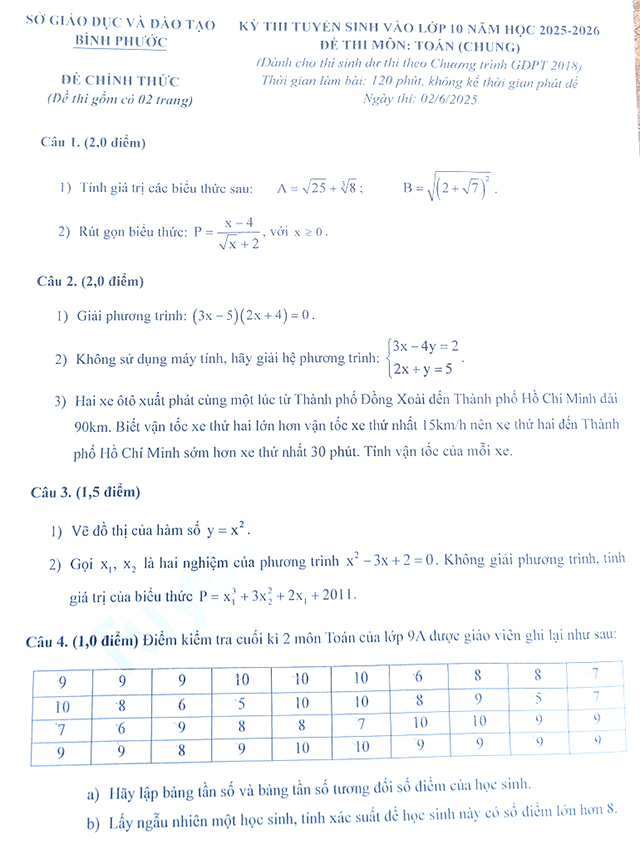 2. Đề thi vào 10 Toán Bình Phước 2025