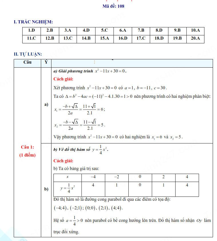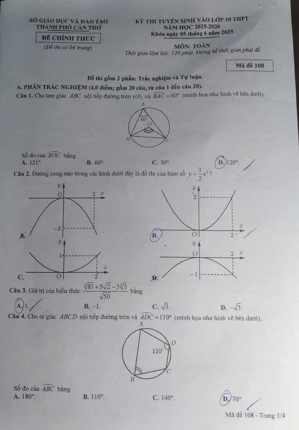 1. Đáp án đề thi vào 10 môn Toán Cần Thơ 2025