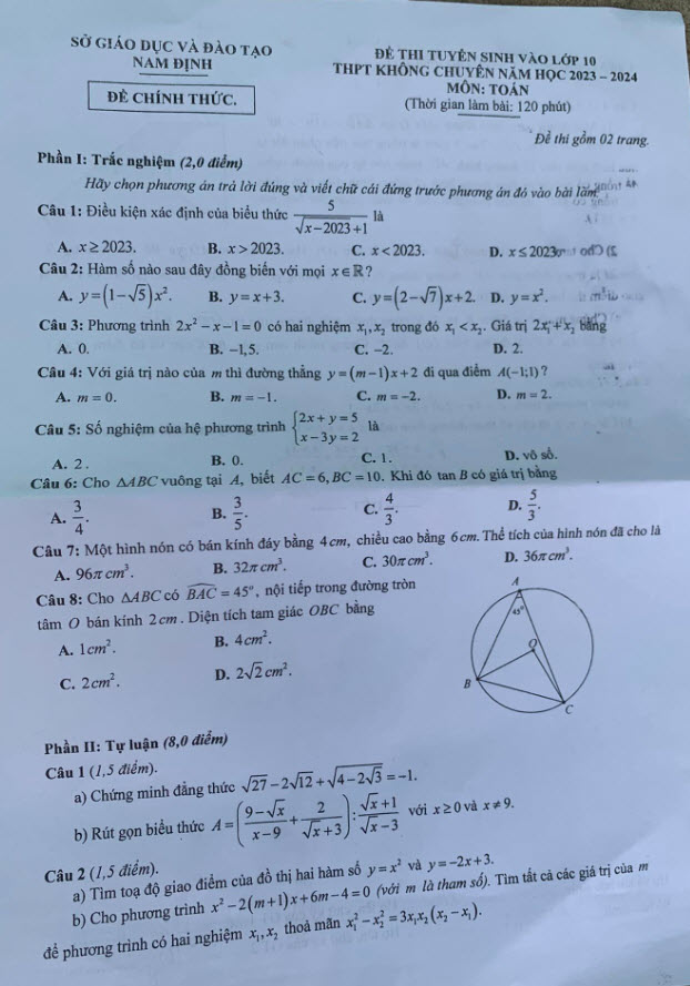 6. Đề thi tuyển sinh lớp 10 môn Toán Nam Định 2023