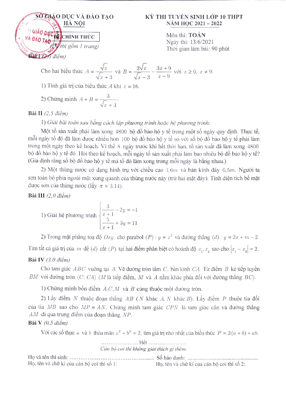 Đề thi vào lớp 10 môn Toán Hà Nội 2021
