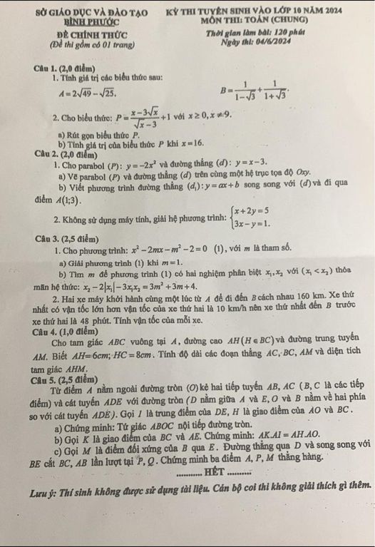 2. Đề thi vào 10 Toán Bình Phước 2024