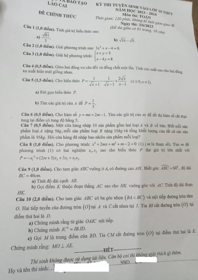 Đề thi vào 10 môn Toán Lào Cai