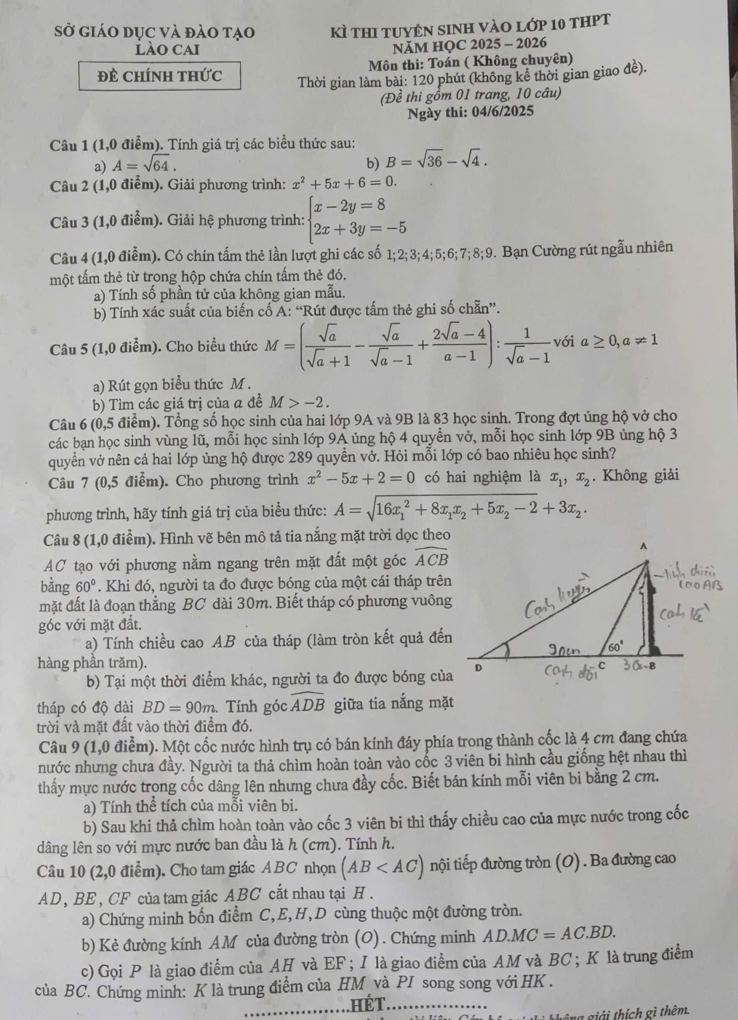 Đề thi vào 10 môn Toán 2025 Lào Cai