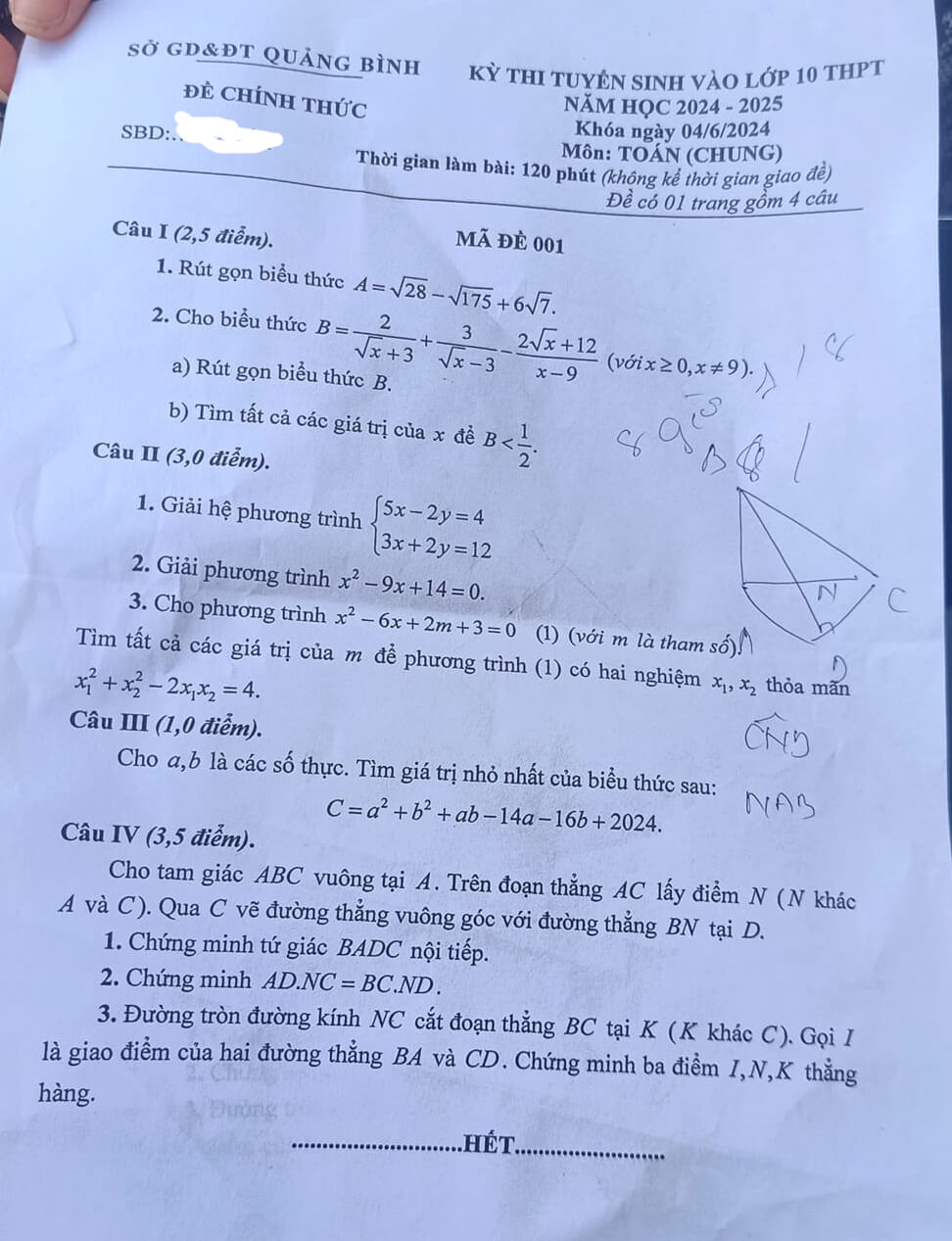 4. Đề thi vào lớp 10 Toán Quảng Bình 2024