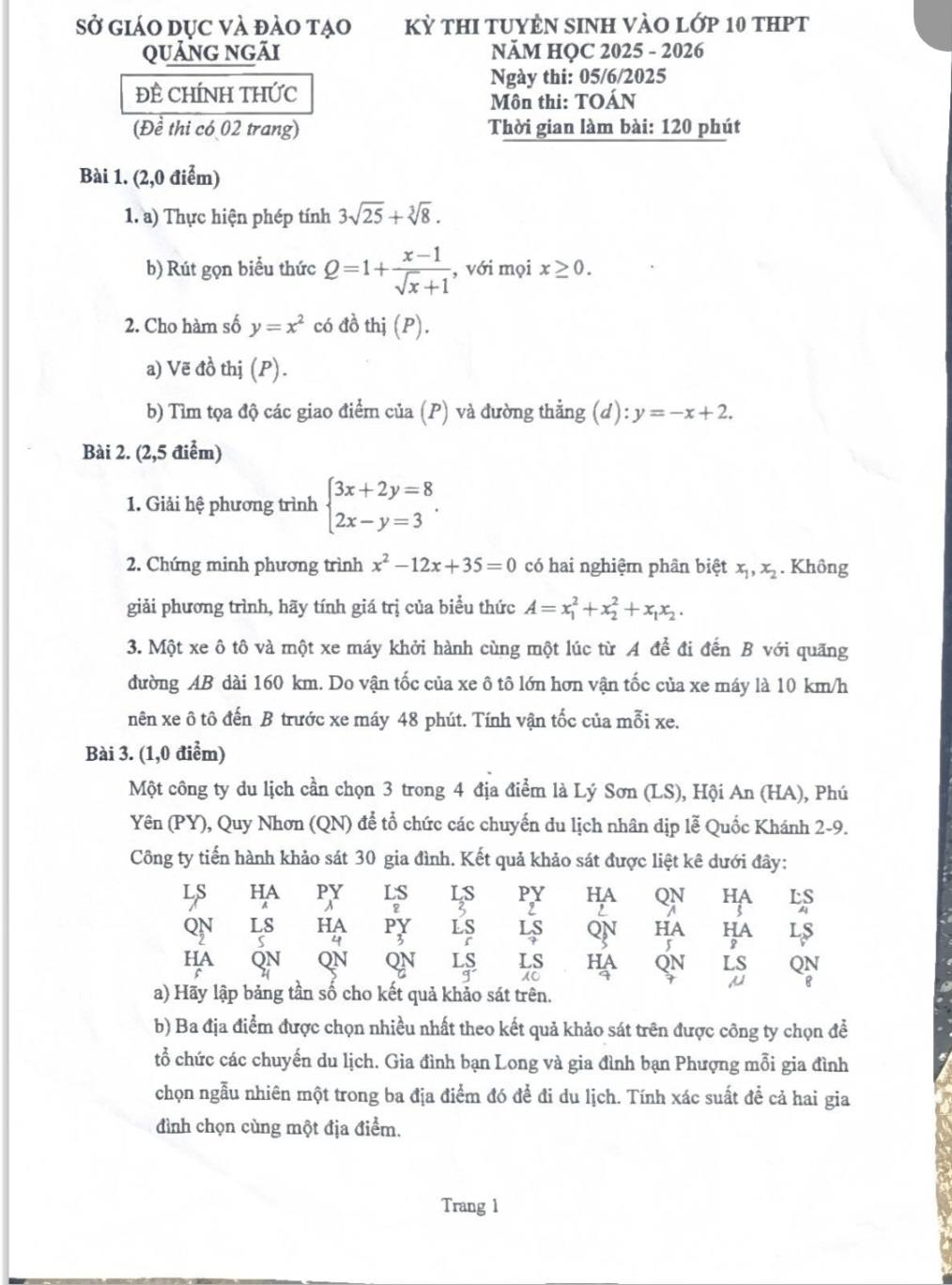 1. Đáp án đề thi vào 10 môn Toán Quảng Ngãi 2025