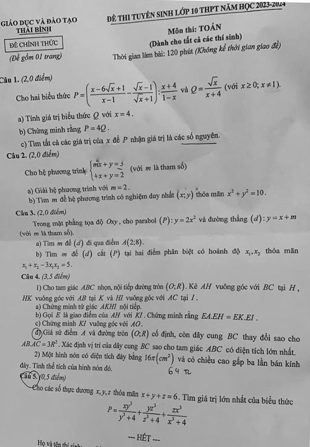 4. Đề thi vào 10 môn Toán Thái Bình 2024