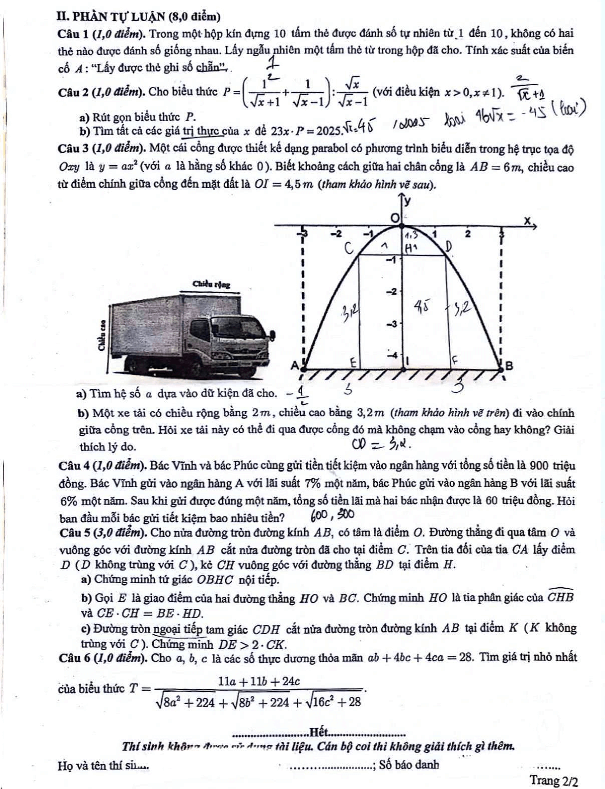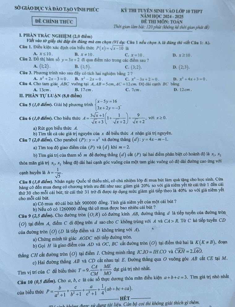 2. Đề thi vào lớp 10 môn Toán Vĩnh Phúc 2025