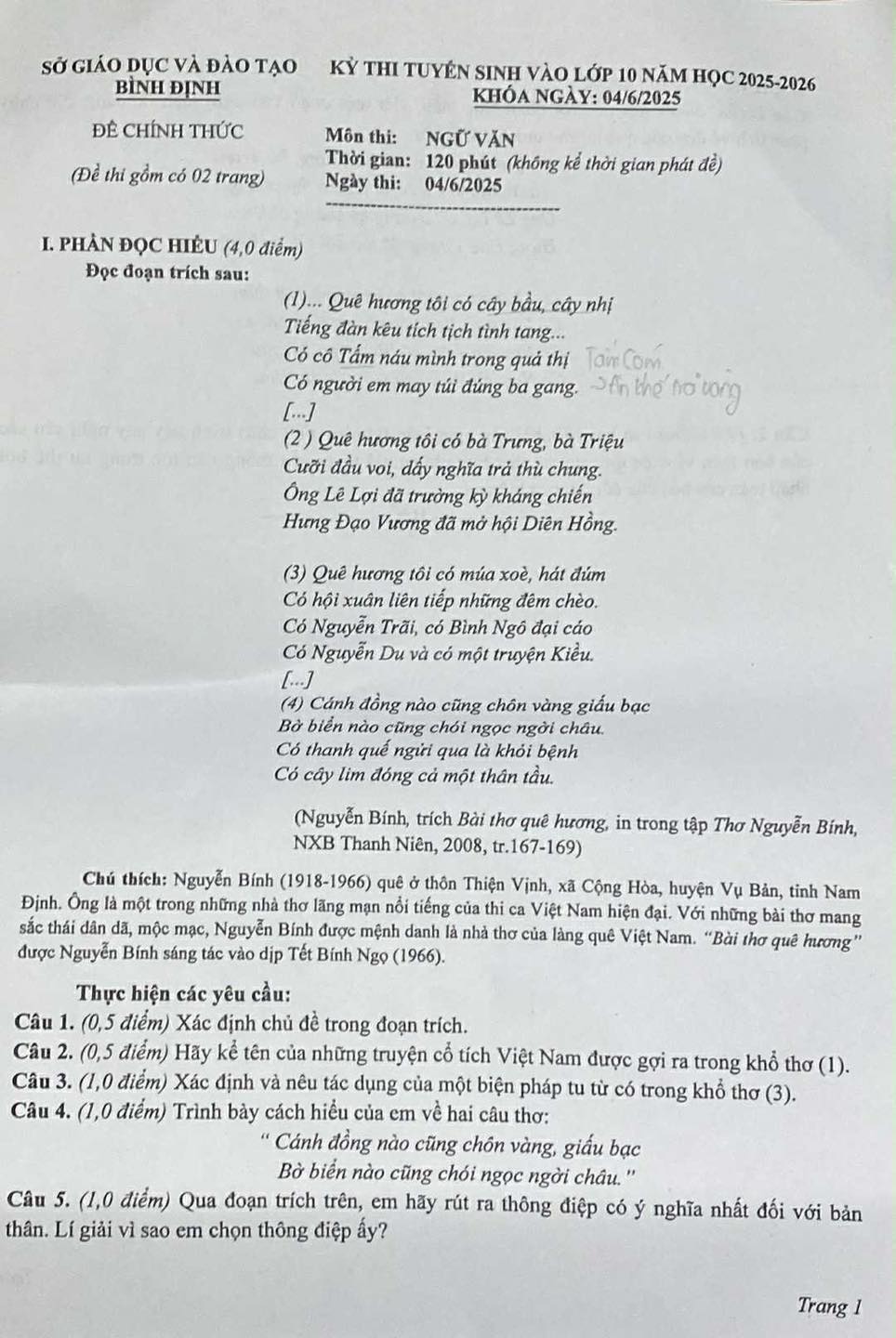 2. Đề thi vào 10 Văn Bình Định 2025