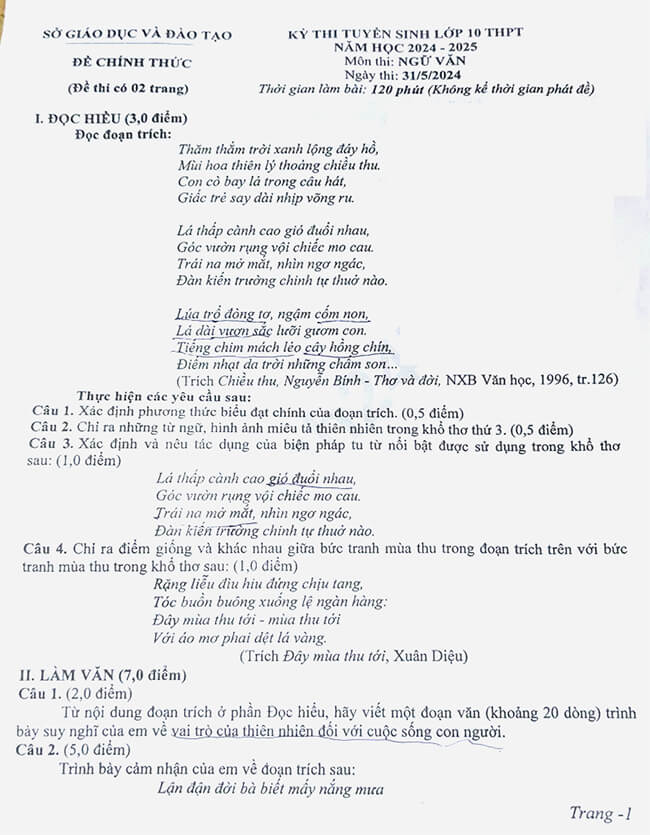 1. Đề thi vào lớp 10 môn Văn tỉnh Bình Dương 2025