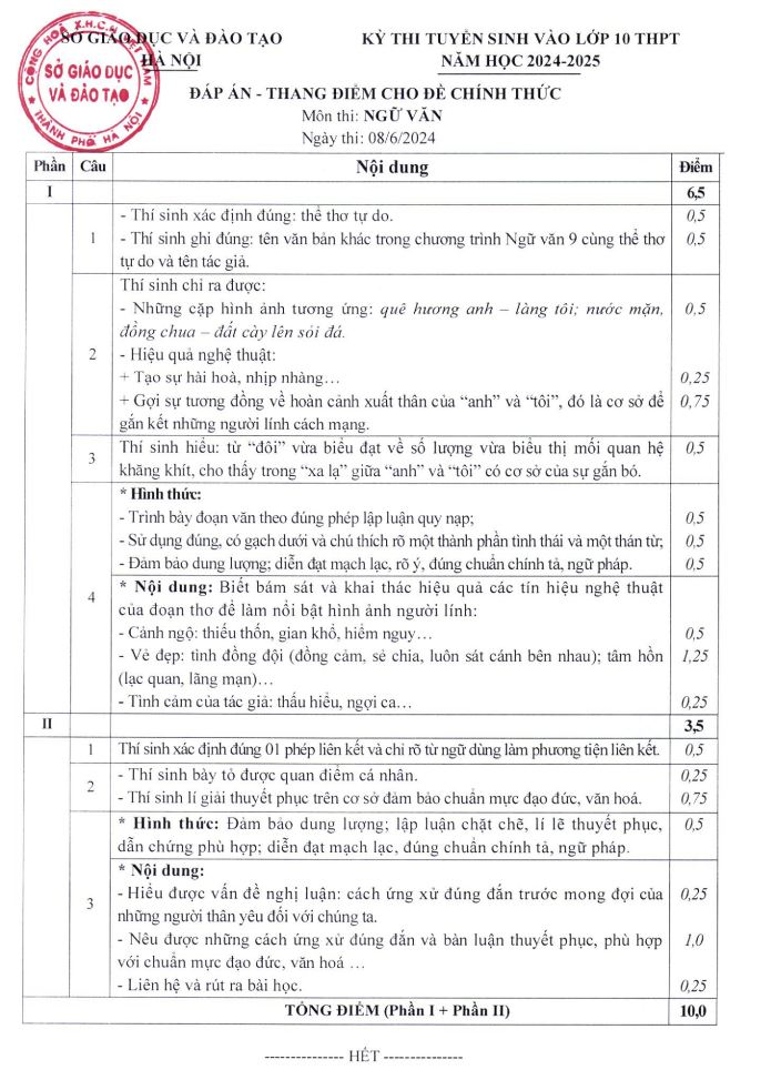 - 3. Đáp án chính thức đề thi vào 10 môn Văn Hà Nội 2024