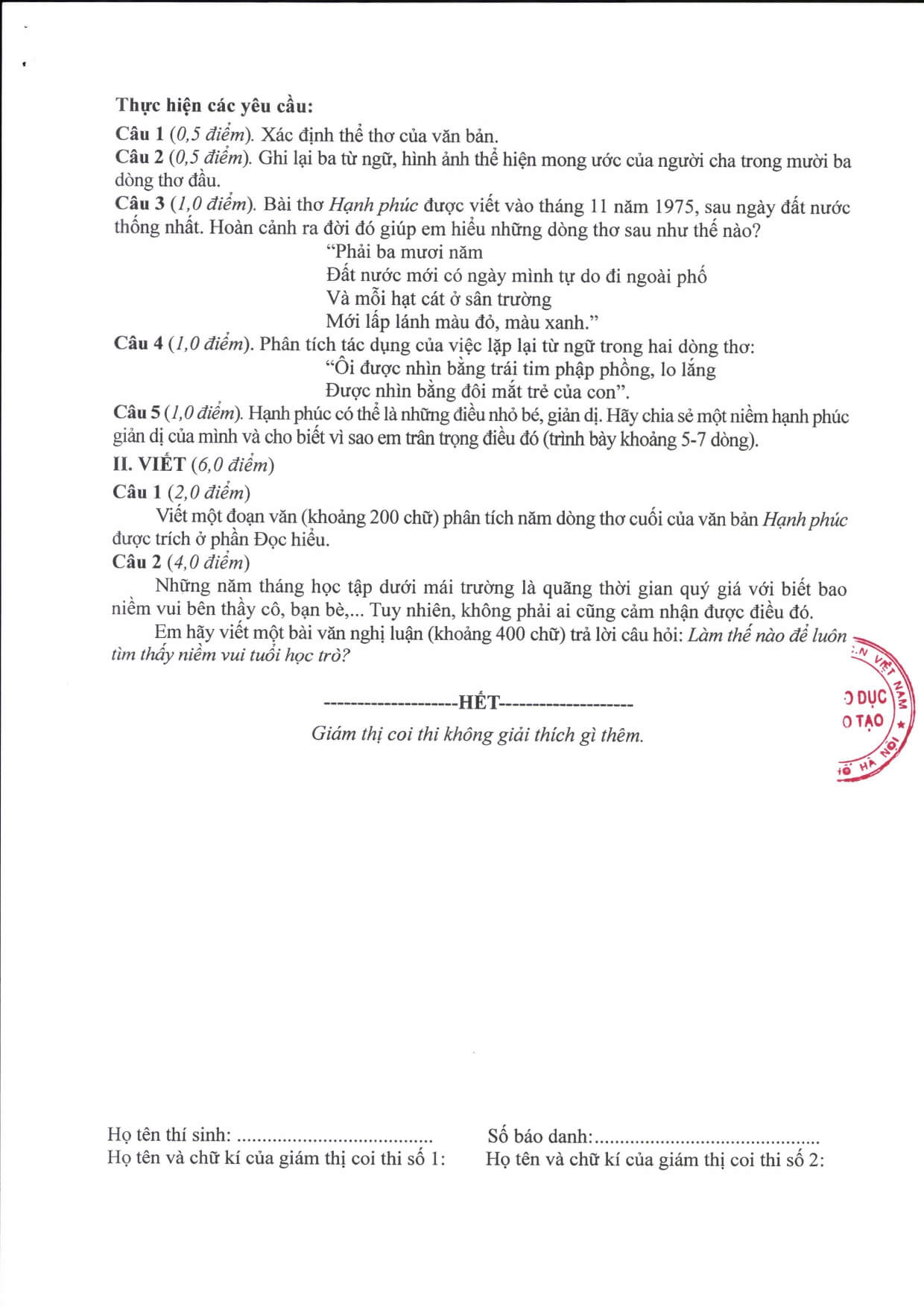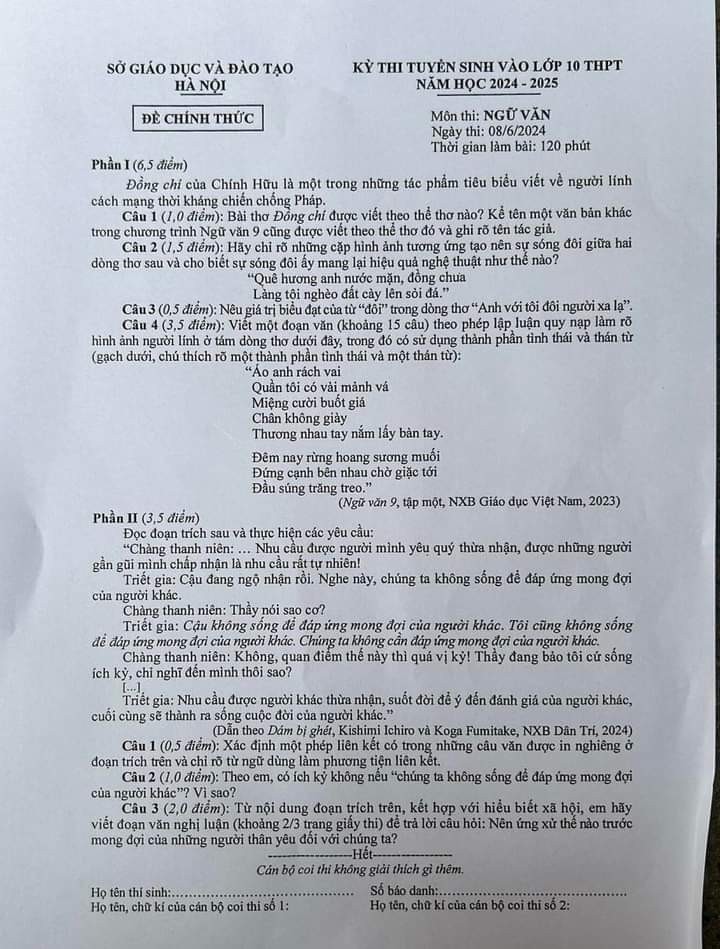 6. Đề và đáp án chính thức kỳ thi tuyển sinh vào lớp 10 Văn Hà Nội 2023