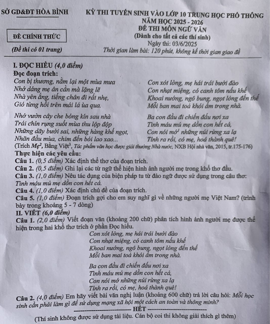 2. Đề thi vào 10 môn Văn Hòa Bình 2025