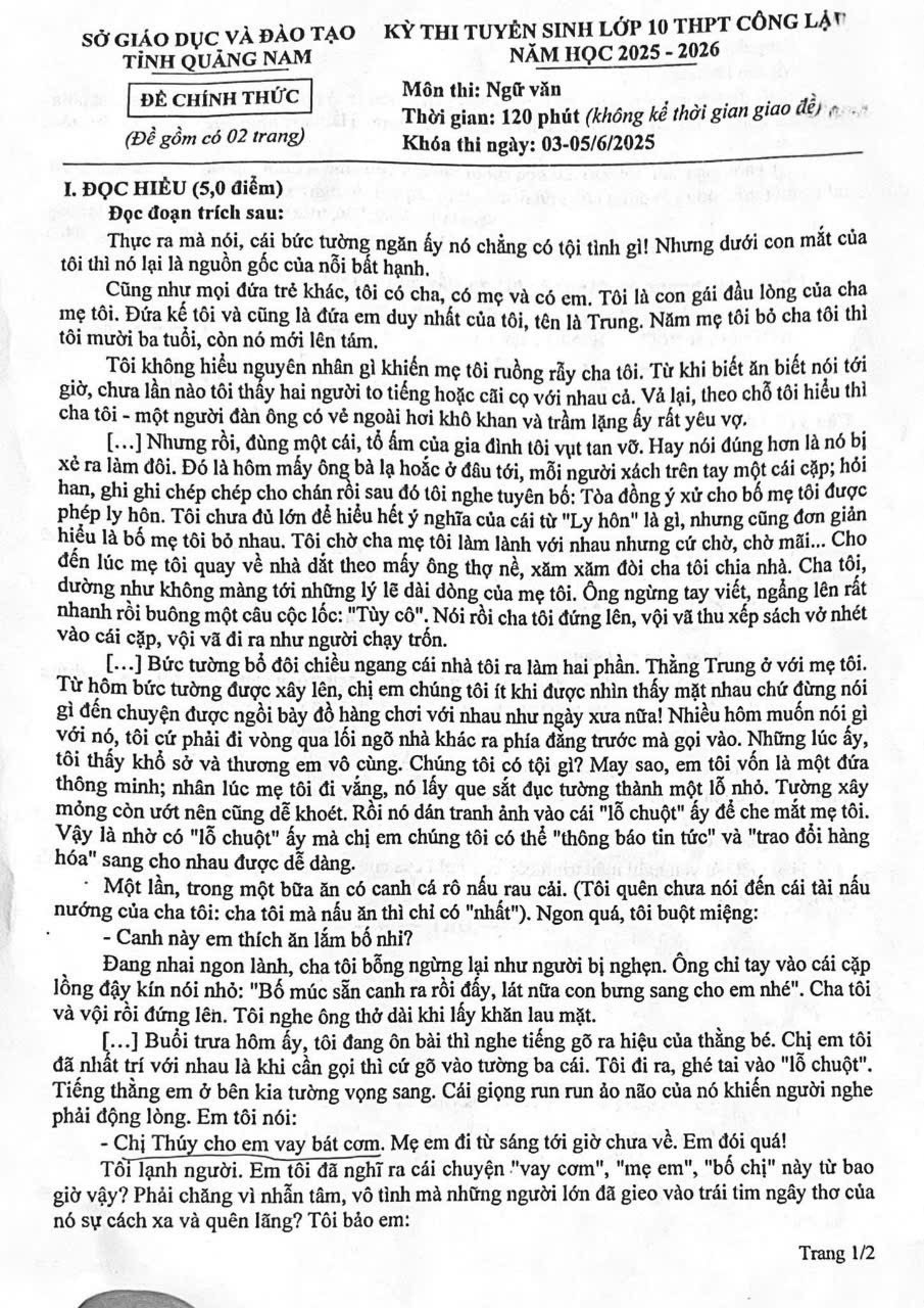 1. Đề thi vào lớp 10 môn Văn Quảng Nam năm 2025