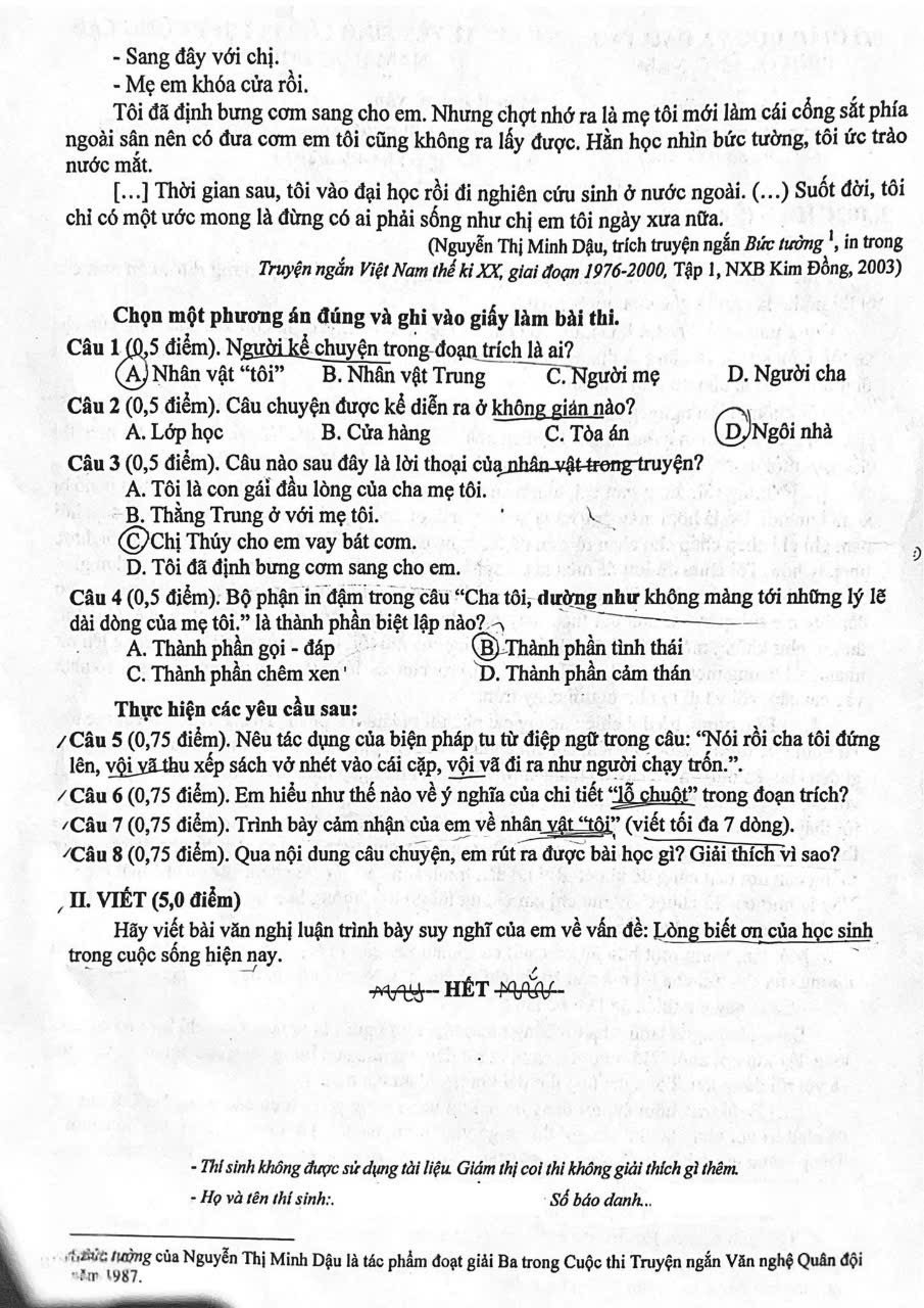 Câu 2. (1,0 điểm) Nêu ngắn gọn cảm nhận của em về vẻ đẹp tâm hồn của nhân vật tôi (Phương Định) trong những câu sau: