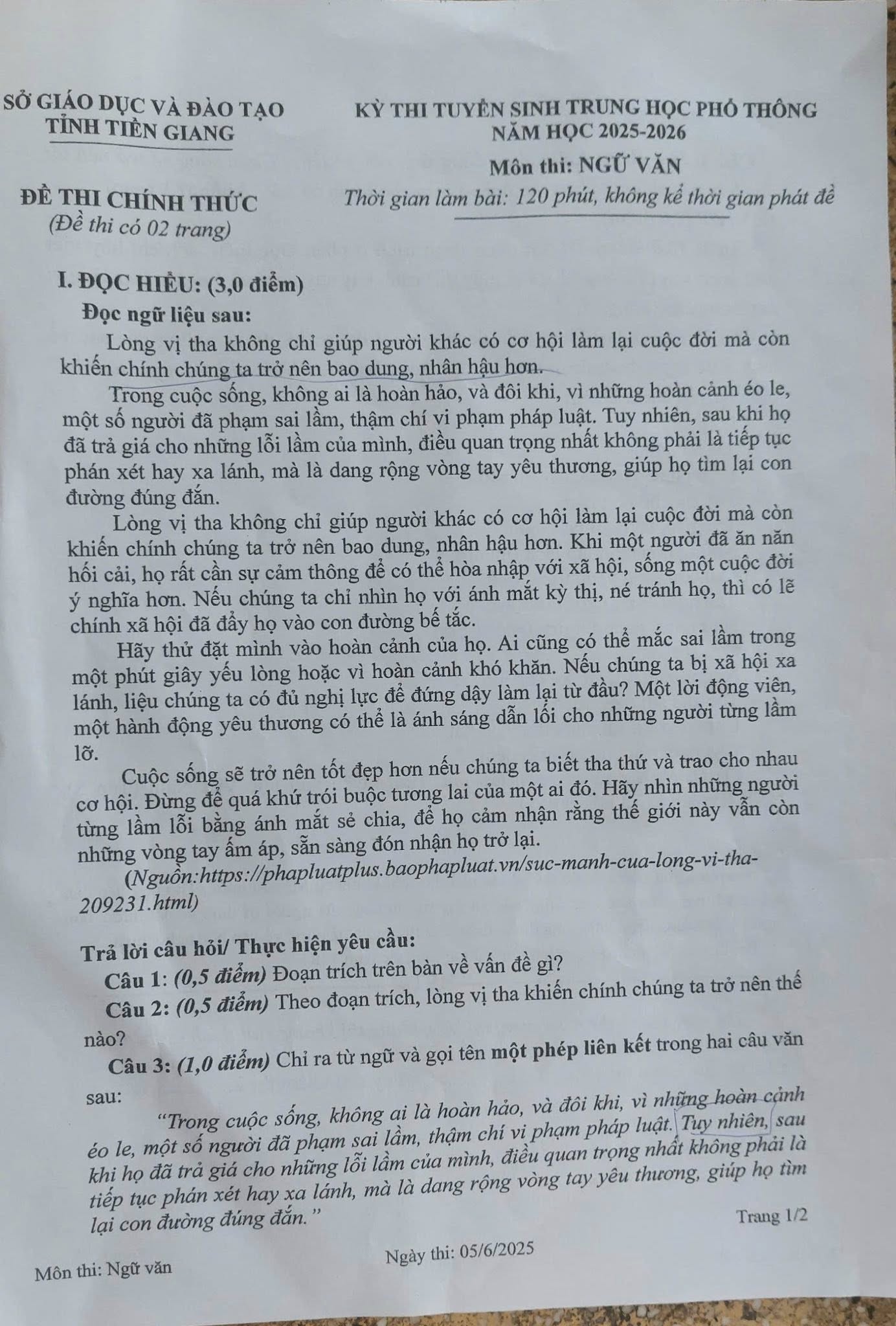 1. Đáp án đề thi vào 10 môn Văn Tiền Giang 2025