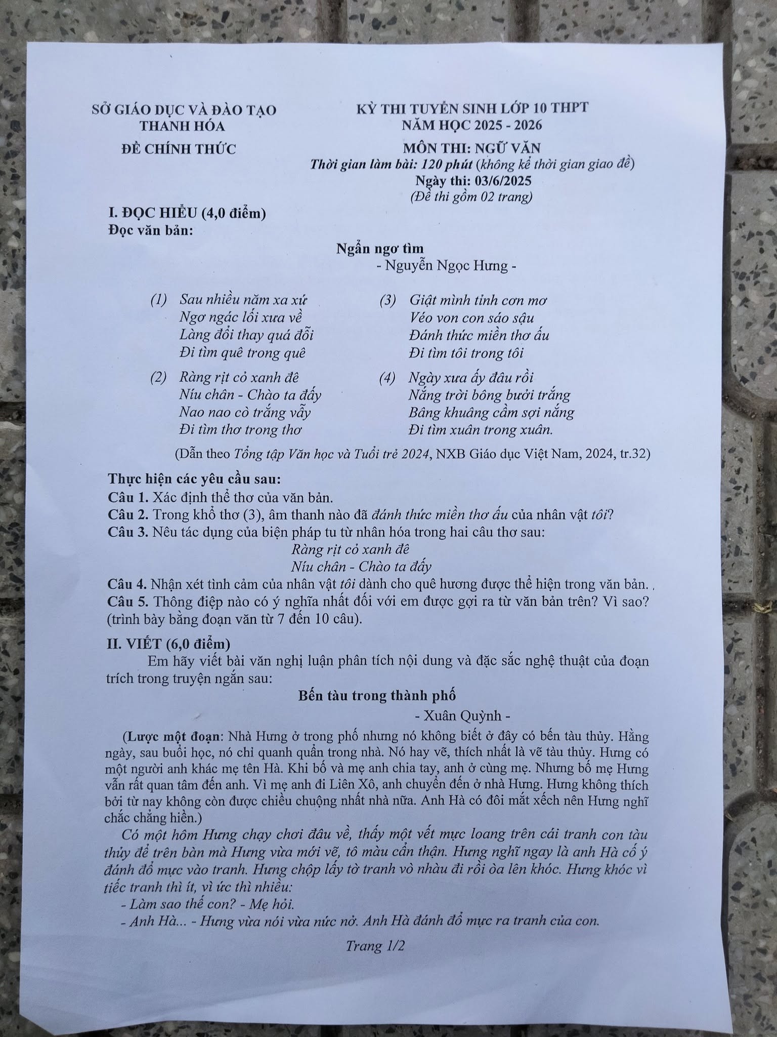 2. Đề thi vào 10 môn Văn Thanh Hóa 2025