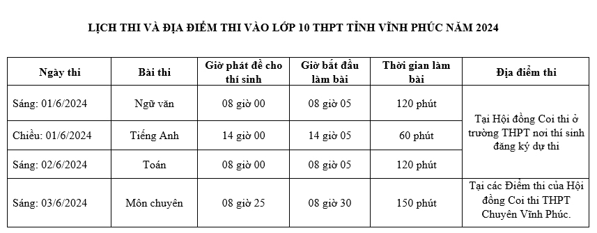 Lịch thi vào lớp 10 Vĩnh Phúc năm học 2025 - 2026: