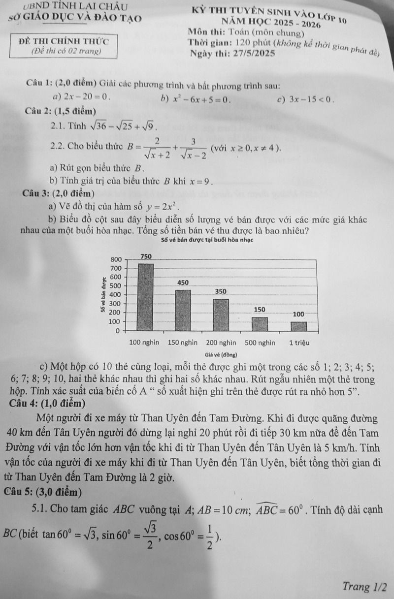 Đề thi vào 10 môn Toán Lai Châu 2025 - 2026