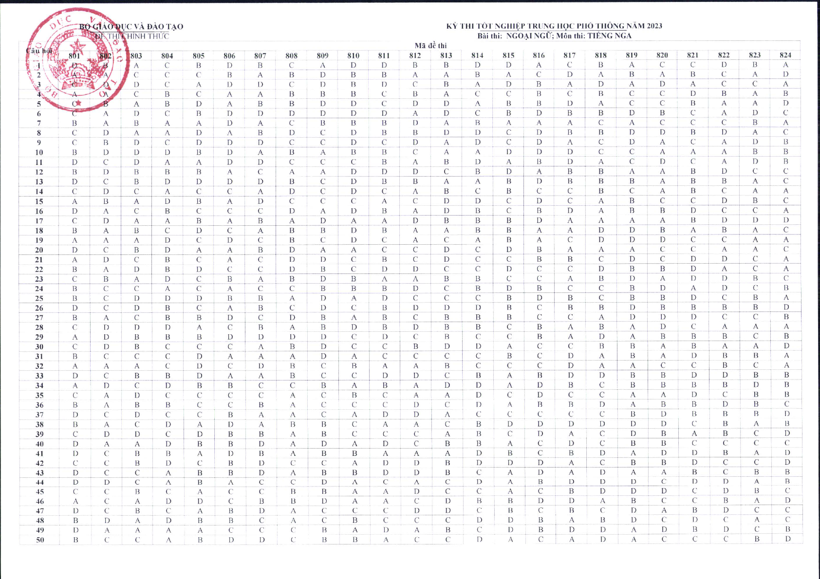 Đáp án toàn bộ 24 mã đề tiếng Nga THPT Quốc Gia 2023 được VnDoc.com cập nhật dưới đây. Đáp án đề thi tốt nghiệp THPT môn tiếng Nga năm 2023 tất cả các mã đề: 801, 802, 803, 804, 805, 807, 808, 809, 810, 811, 812, 813, 814, 815, 816, 817, 818, 819, 820, 421, 822, 823, 824.
