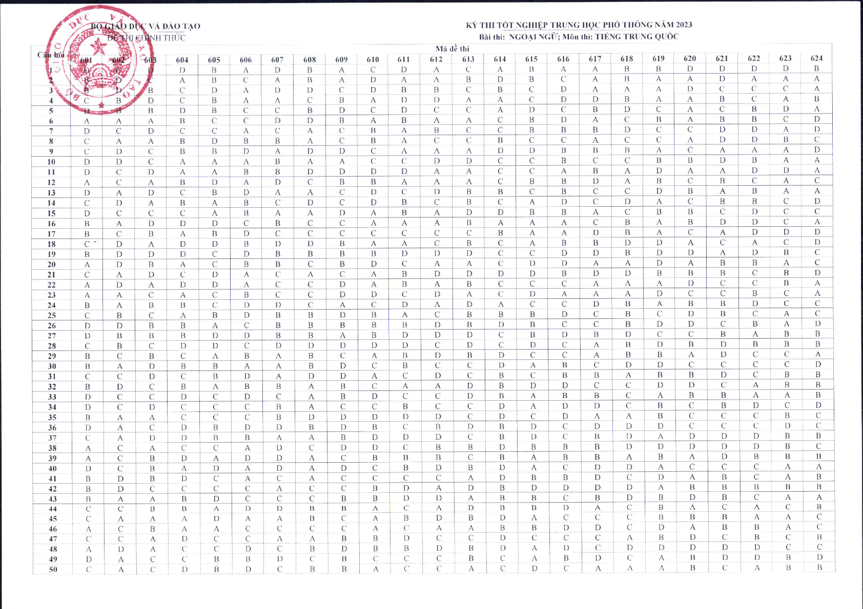 Đáp án chính thức môn tiếng Trung THPT Quốc Gia 2023