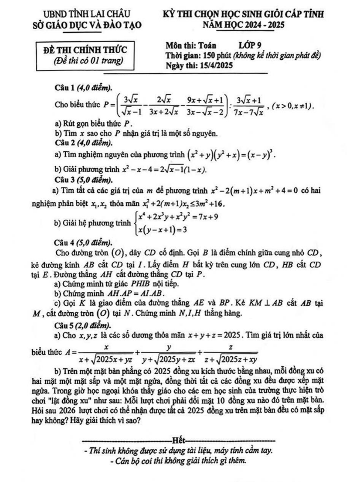 Đề chọn học sinh giỏi tỉnh Toán 9 năm 2024 – 2025 sở GD&ĐT Lai Châu