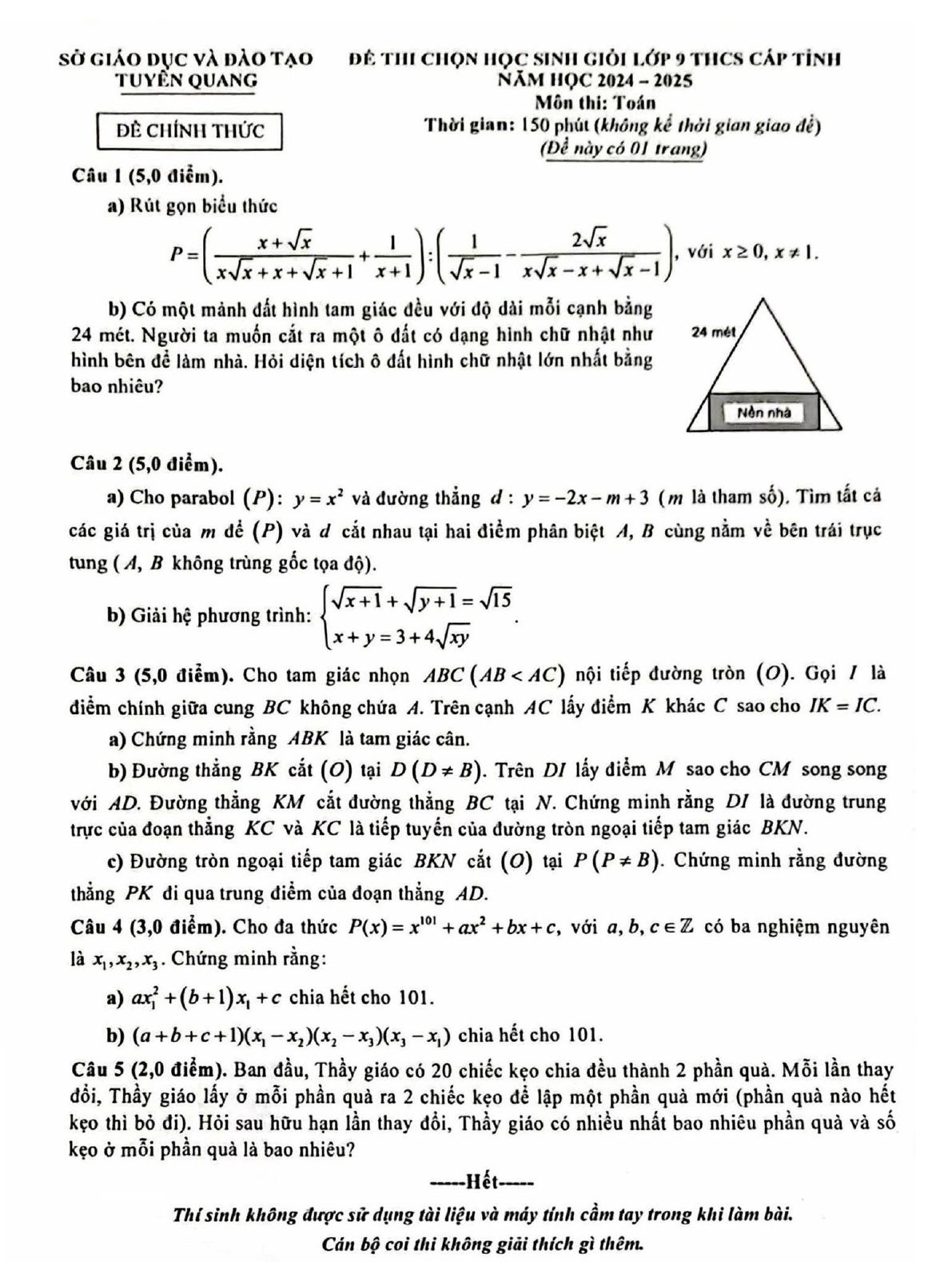 Đề chọn học sinh giỏi tỉnh Toán 9 năm 2024 – 2025 sở GD&ĐT Tuyên Quang